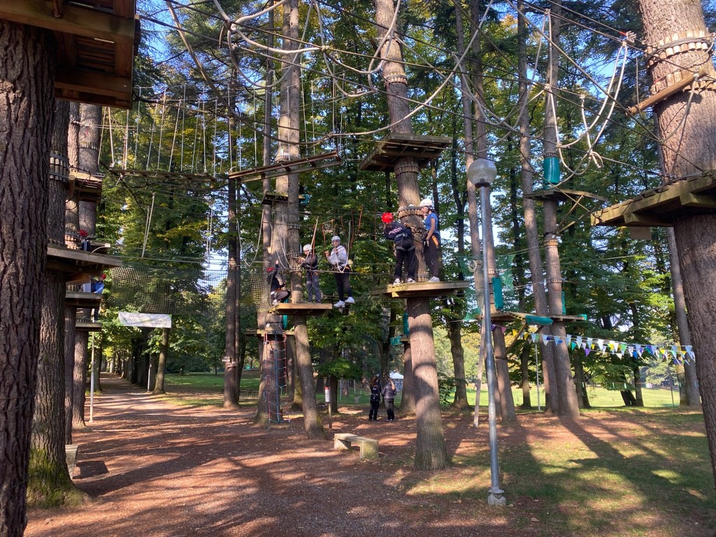 Il 9 ottobre 2025, le classi 2D, 2B e 2E si sono recate al Parco Avventura di Salice Terme per vivere un’avventura meravigliosa e molto eccitante. Alle 8 del mattino, ci siamo ritrovati in piazzale Gramsci, davanti al Gelatiere: lì ci aspettava il bus privato che ci ha condotti alla meta dopo un viaggio di quaranta minuti. Durante il tragitto, ci siamo divertiti ascoltando musica, parlando tra noi e facendo delle foto.