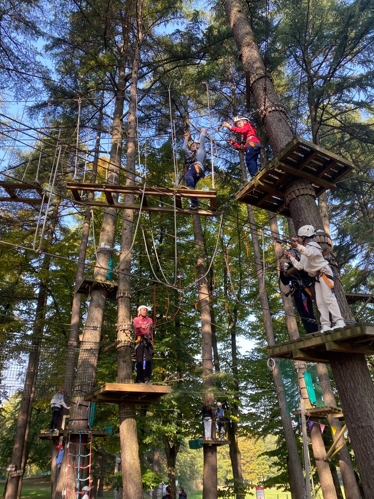 Appena arrivati, ci hanno fatto posare gli zaini e ci hanno fatto indossare i caschi e le imbracature. Quindi, ci siamo divisi in piccoli gruppetti. Dopo le spiegazioni sulle norme di sicurezza, abbiamo iniziato a salire verso i percorsi sugli alberi, che erano tanti ed erano divisi in vari colori: rosso, verde e blu. Il percorso rosso era il più semplice, il verde era il medio, poi c’era il blu che era il livello più difficile. A completamento, c’era un percorso molto difficile che consisteva in una arrampicata in verticale lungo il tronco di un albero per una decina di metri fino ad una campana che bisognava suonare per far capire che si era riusciti ad arrivare.