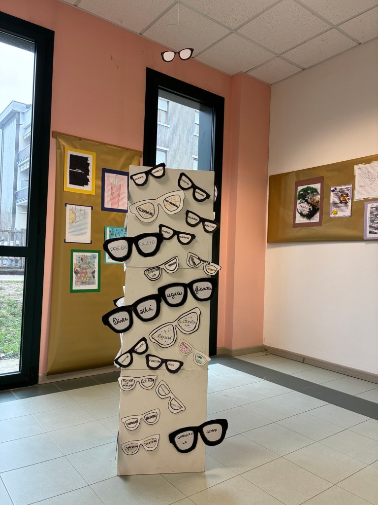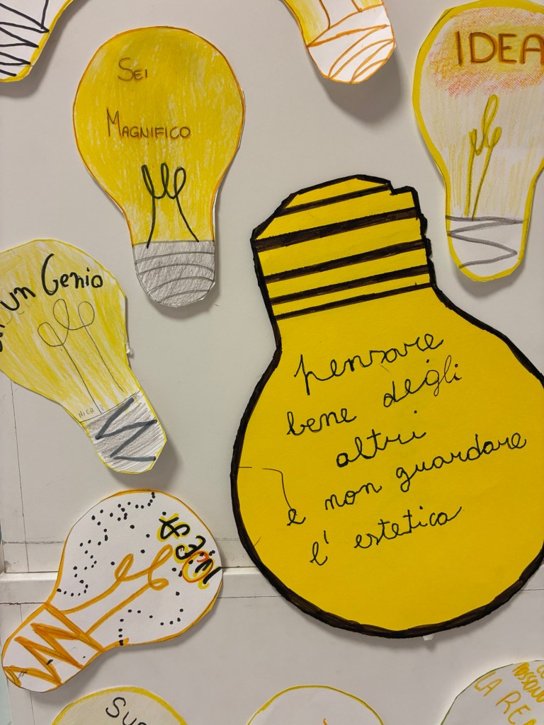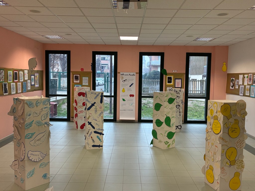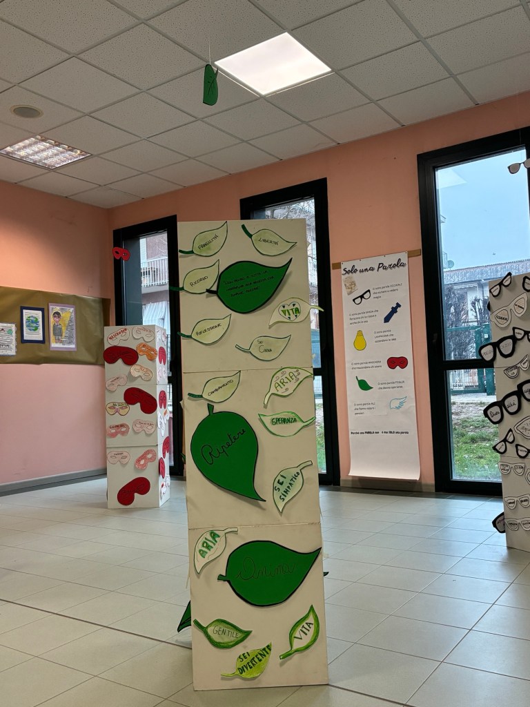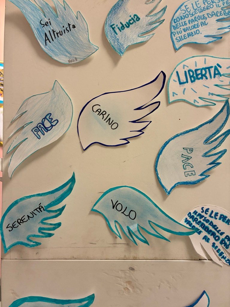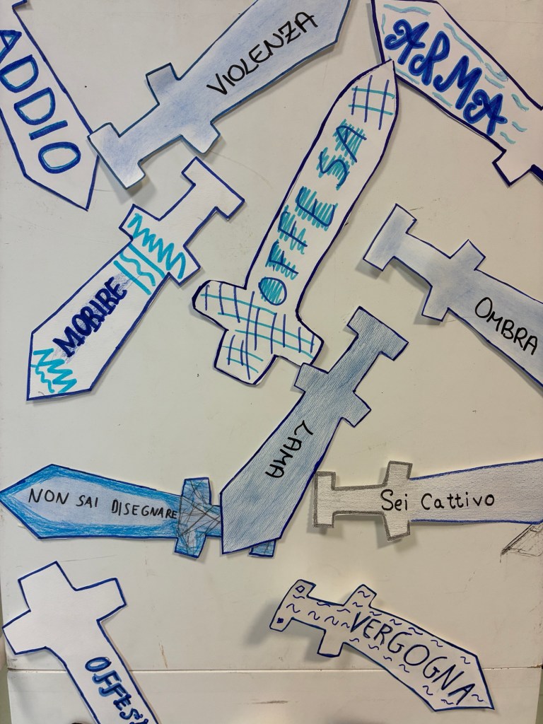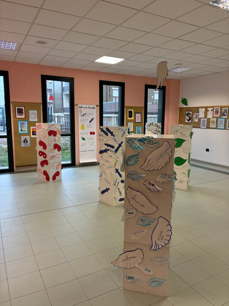 Il 27 gennaio, i bambini di quinta della scuola primaria “Tina Pesaro” e i ragazzi di terza della scuola secondaria “G. Mazzini” hanno guidato la riflessione per fare Memoria: le loro parole sono state perle preziose che si sono espresse con la musica e che si sono anche trasformate in una mostra, dove le parole si sono fatte simboli, pensieri, poesia. Infatti, i bambini hanno letto il libro “Solo una parola” e hanno lavorato su alcune parole-chiave: occhiali, lampadina, ali, maschera, foglia, spada. Esistono, infatti, parole-spada che feriscono chi le usa e chi le riceve, parole-foglia che danno speranza, parole-occhiali che ti fanno vedere meglio la realtà. Dopo aver disegnato delle sagome e scritto le loro riflessioni, le quinte hanno allestito la loro mostra.