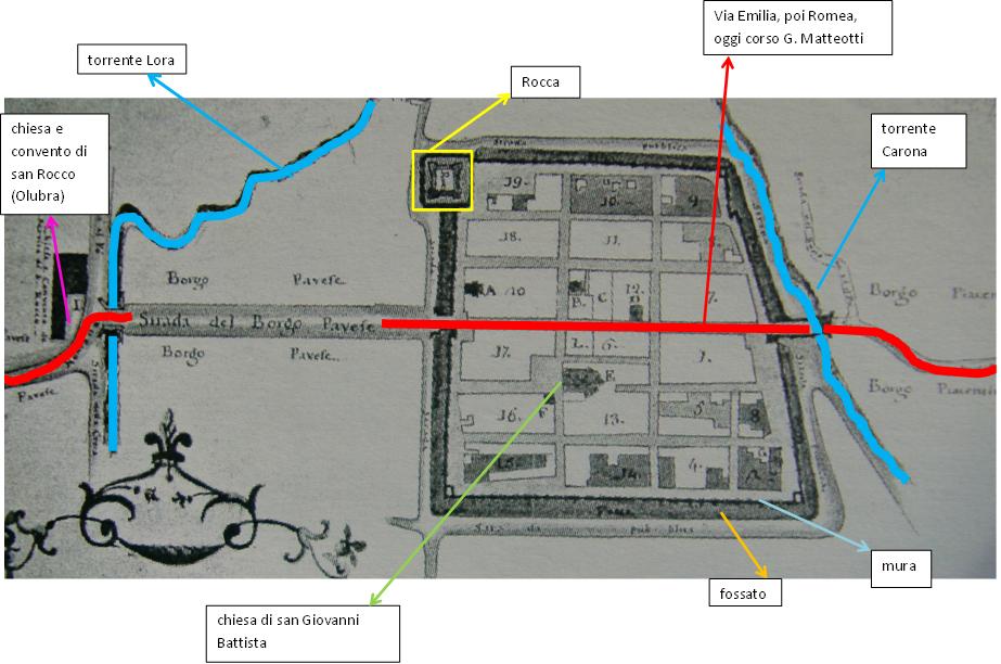 (“Recinto di Castel San Giovanni d’Olubra – suoi borghi annessi”: mappa di Piergiorgio Medagliani dell’anno 1793, conservata all’archivio di stato di Parma).