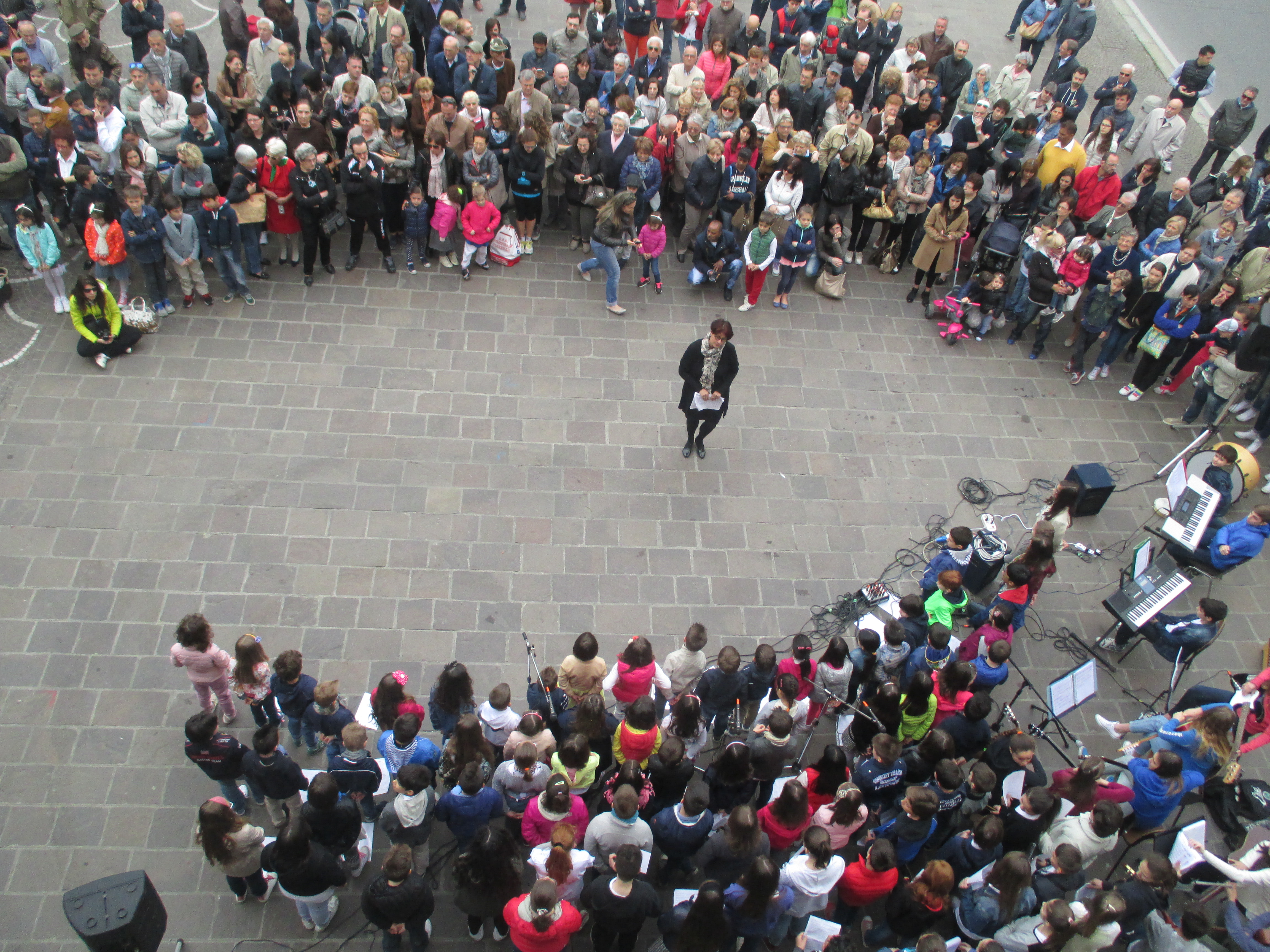 L’affollata piazza XX Settembre il 25 aprile 2015I canti proposti sono stati quelli della tradizione: “Bella Ciao”, “Il Bersagliere ha cento penne” e l'”Inno degli Italiani”. Tuttavia, quest’anno abbiamo proposto anche una canzone di origine giapponese, intitolato “Kora no Mitamaya yo”. Il testo, che evoca la terribile tragedia di Hiroshima e Nagasaki, si rifà ad un’antica leggenda giapponese: quella delle gru, simbolo di lunga vita. Quando scoppiò la bomba atomica, una ragazzina di nome Sadaku Sasaki, venne colpita dalle radiazioni che le causarono una grave forma di leucemia.
