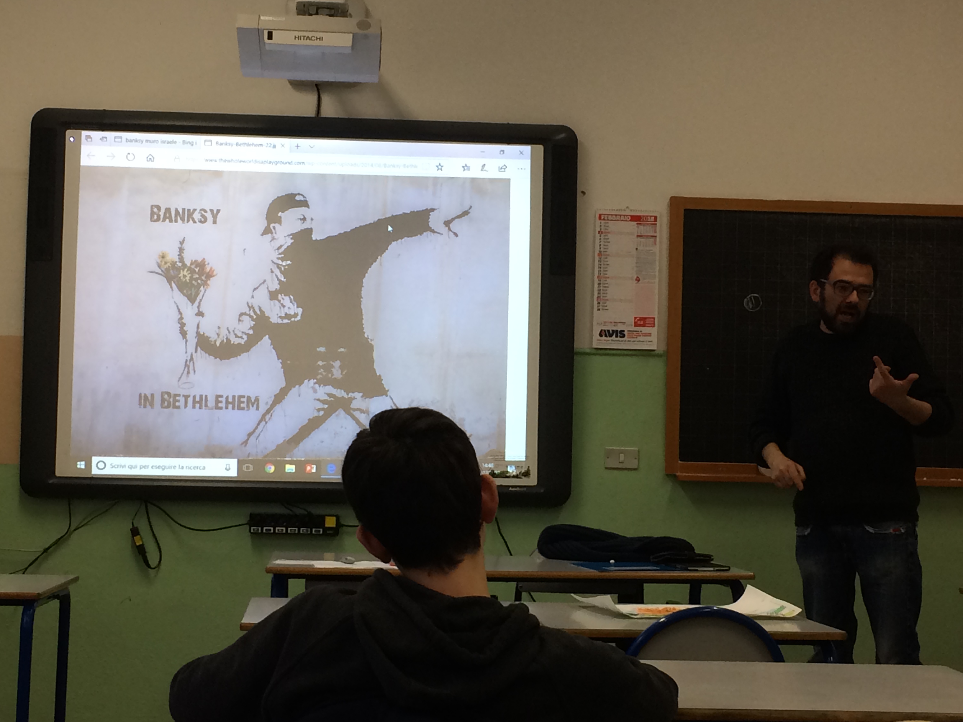 e adesso… il murales in via di realizzazioneIl progetto è iniziato con una lezione sulla storia della Street Art: dai semplici graffiti preistorici propiziatori ai grandi artisti di strada dei giorni nostri, come Banksy e Blu, creatori di murales famosi in tutto il mondo. La Street Art non è vandalismo, è espressione artistica che arriva a tutti perché non è chiusa in un museo, il suo messaggio è spesso legato ai temi di attualità perché deve far riflettere chi la guarda.