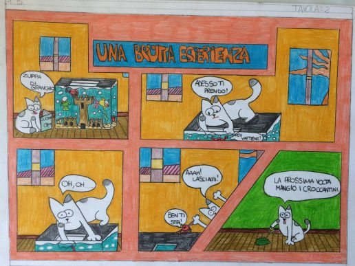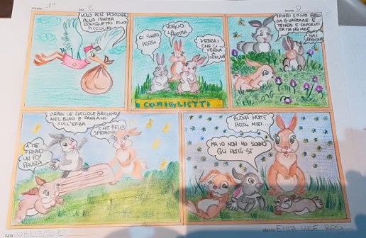 Anche noi ci siamo cimentati in questa impresa e abbiamo realizzato dei fumetti seguendo la seguente consegna: dovevamo disegnare su di un foglio da disegno elementi presi dal mondo animale, minerale o vegetale (non umani e non fantasmi), la tecnica da usare era il disegno a matita e i pastelli, potevamo disegnare al massimo 4/5 scene con dialoghi non troppo lunghi.