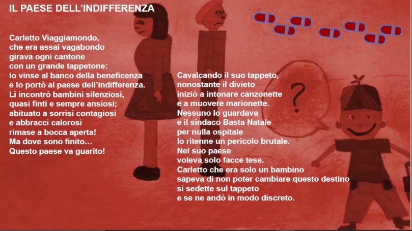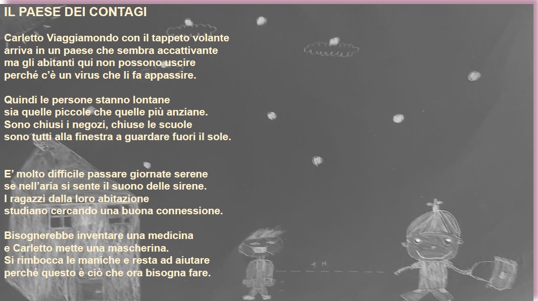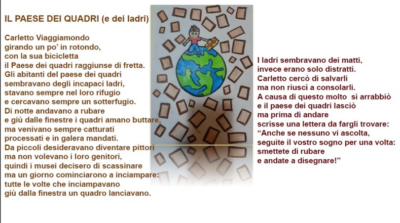 In questo strano periodo di didattica a distanza, abbiamo continuato a lavorare su Gianni Rodari. Nella classe 1^A abbiamo letto le avventure di Giovannino Perdigiorno, cioè un ragazzino inventato da Rodari che viaggia e che capita in paesi molto strani: in ogni paese che visita ci sono degli abitanti strampalati, con abitudini diverse che commettono degli errori o si comportano male. Giovannino riflette sui problemi e suggerisce delle possibili soluzioni. Le storie sono raccontate in rima. Nella classe abbiamo agito così: ci siamo divisi in gruppi nei quali ognuno aveva un compito e abbiamo cominciato a costruire il nostro testo. Abbiamo innanzitutto scelto un nuovo personaggio, Carletto Viaggiamondo, abbiamo inventato dei paesi che fossero la meta dei suoi viaggi e quindi abbiamo scritto le filastrocche. Per completare il tutto, abbiamo disegnato le immagini che accompagnassero le nostre filastrocche. Queste sono alcune delle nostre poesie: