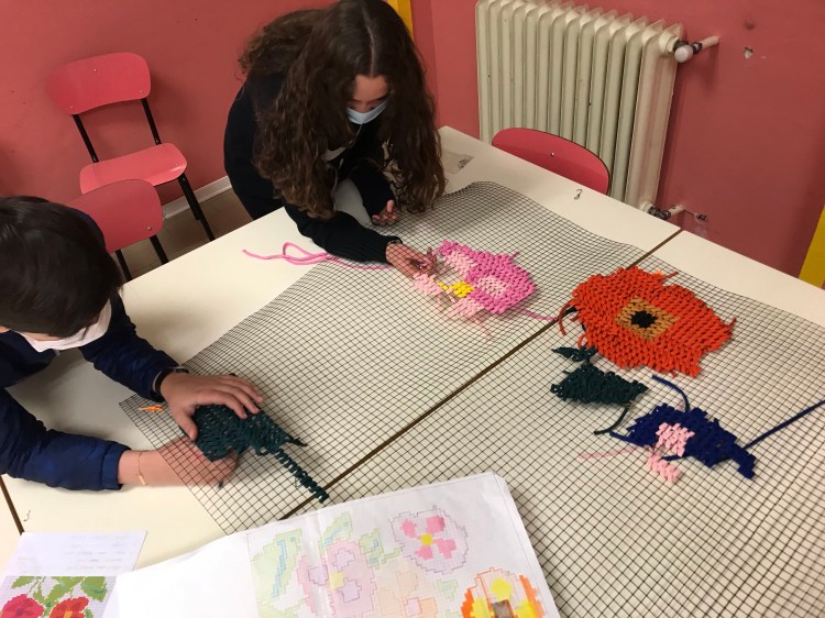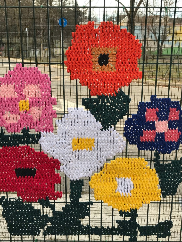 I fiori realizzati sono però diversi da come si potrebbe immaginare, infatti sono stati tessuti con del filo di cotone colorato sopra ad una rete metallica, utilizzando la tecnica del punto e croce. Si tratta di un lavoro di street art, molto usato dagli artisti di tutto il mondo, che ha come obiettivo quello di trasformare un angolo urbano poco significativo (una rete metallica) in un’opera colorata, che attiri l’attenzione. Gli alunni, con l’aiuto delle professoresse Cesena, Pedretti e Antoniotti hanno realizzato l’opera, sapendo che ciò che stavano creando avrebbe aiutato le persone a ricordare gli orrori della Shoah.