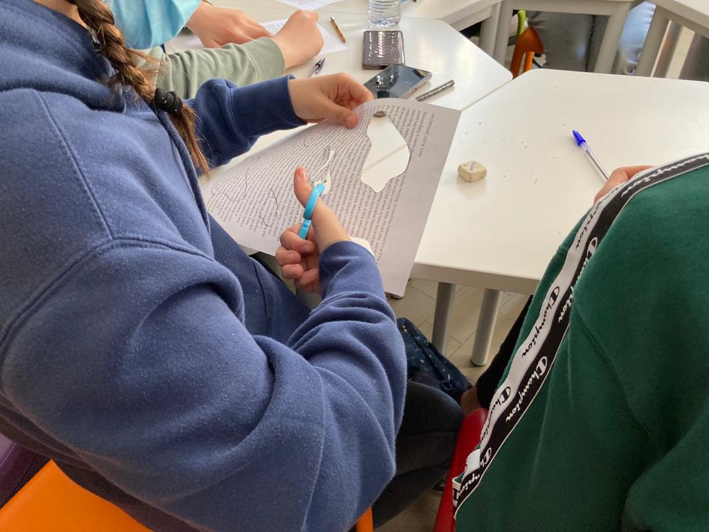 One of my favorite works is when, after listening to Mrs. Antoniotti’s voice, we took some printed pages from Anne’s diary in English and used the technique of caviardage.