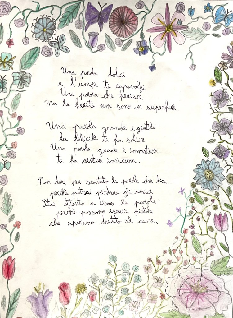 Dopo la lettura, la classe ha lavorato realizzando alcune poesie per esprimere cosa significano le parole, cosa possono fare e come usarle. La nostra riflessione si completerà con la visione del film “Il ragazzo dai pantaloni rosa”.