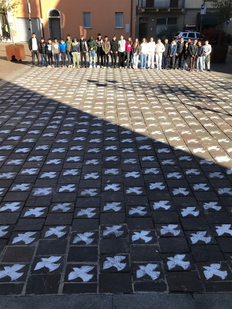 Il 4 novembre, nella piazza davanti alla collegiata di Castel San Giovanni, tutti i ragazzi di terza media della scuola “Giuseppe Mazzini” hanno partecipato alla commemorazione del 4 novembre che celebra la fine della Prima Guerra Mondiale, le forze armate e l’unità nazionale. Erano le 10.00, il sole splendeva, il cielo era molto limpido e tutto era pronto per il tanto atteso flash mob. Attraverso degli stencil preparati precedentemente e dei gessetti bianchi, i ragazzi hanno disegnato uno stormo di colombe, in volo verso la scuola, sul selciato della piazza.