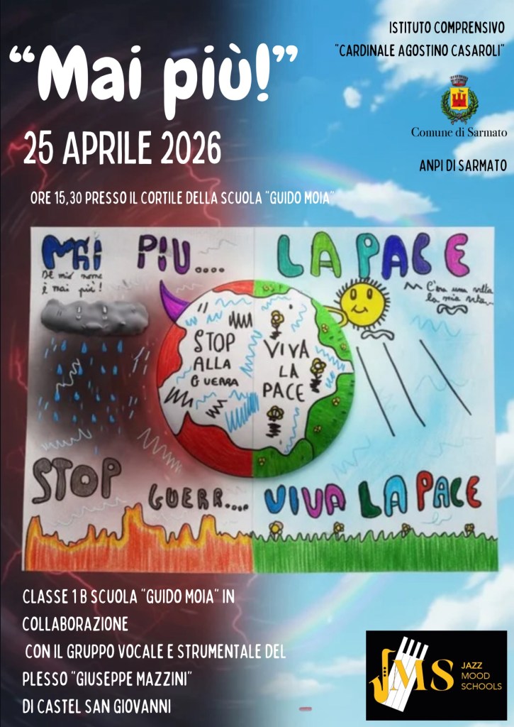 In occasione delle celebrazioni del 25/4/2026, i ragazzi della classe secondaria 1 B di Sarmato, guidati dai loro prof. Valiante, Castronuovo, Intrisano, Pollastri e Vannucci, hanno preparato un bellissimo lavoro interdisciplinare contro le guerre. Hanno inoltre lavorato con il Gruppo vocale e strumentale del plesso “G. Mazzini” per portare il loro contributo alla commemorazione che si terrà il giorno 25/4 alle ore 15,30 presso il cortile della scuola “Guido Moia”.