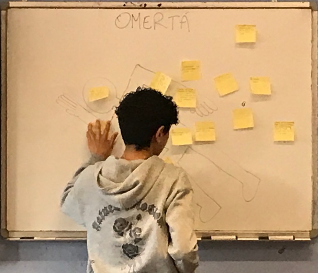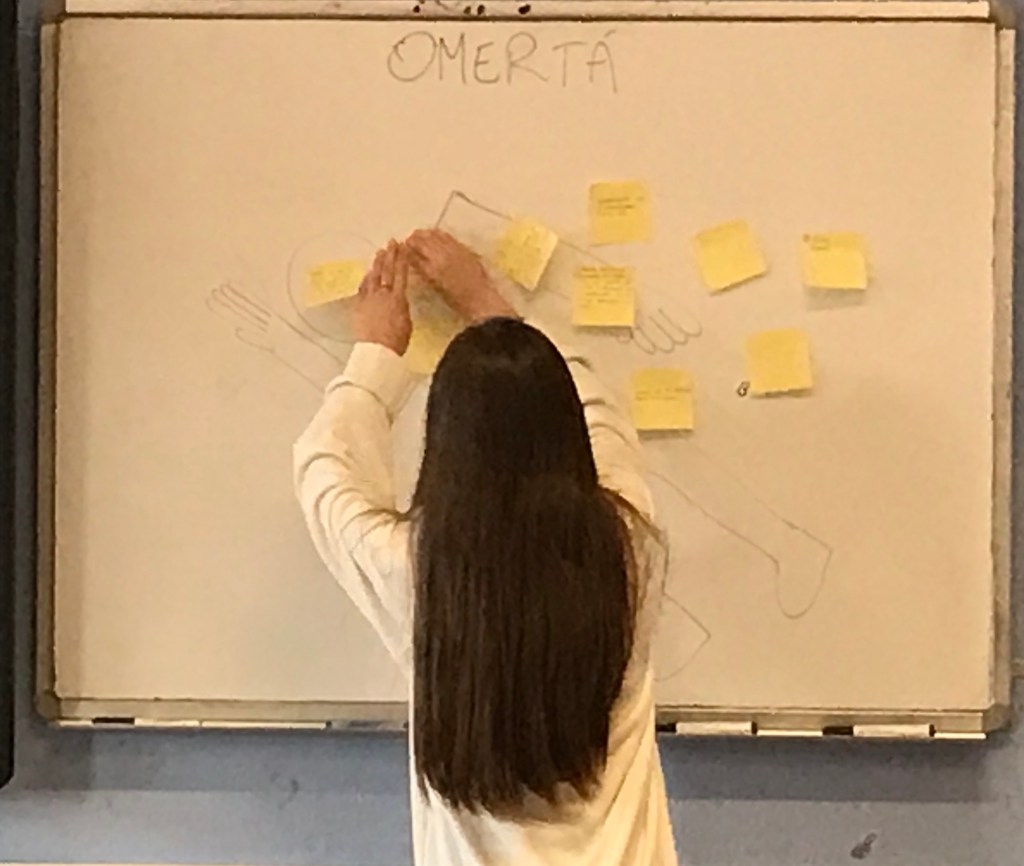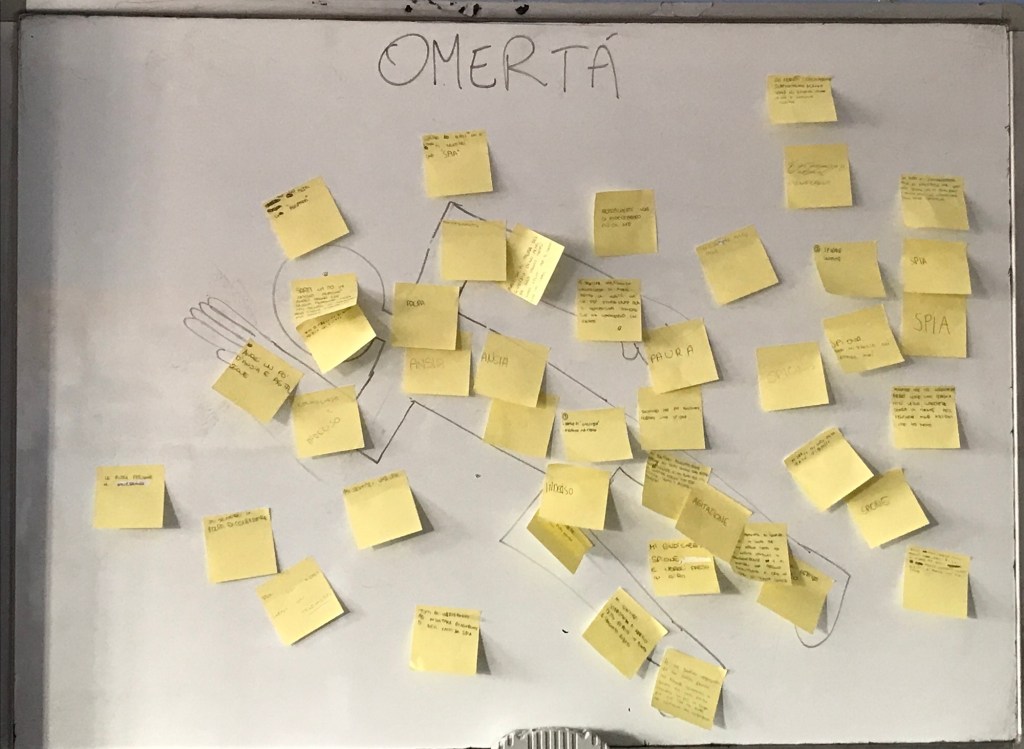 Infatti, per farci riflettere sul fatto che atteggiamenti mafiosi siano più frequenti di quanto si possa pensare, Lorenzo ci ha proposto un caso da analizzare: abbiamo visto un ragazzo che ha rubato delle caramelle al bar. Come ci comportiamo? In un post it abbiamo provato a scrivere come ci sentiremmo se provassimo a dire a qualcuno, ad esempio, un professore, quello che è successo. In un altro, quello che gli altri penserebbero di noi. Poi abbiamo incollato i due post it rispettivamente dentro e fuori una sagoma umana disegnata alla lavagna.Successivamente ne abbiamo letti alcuni ed è emerso che alcuni, denunciando il fatto si sentirebbero orgogliosi ma anche in colpa verso il compagno, (se fosse un amico), alcuni soddisfatti, alcuni invece avrebbero paura di essere considerati delle spie, dei traditori.