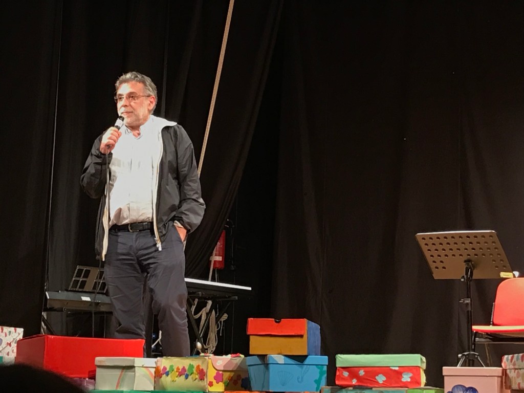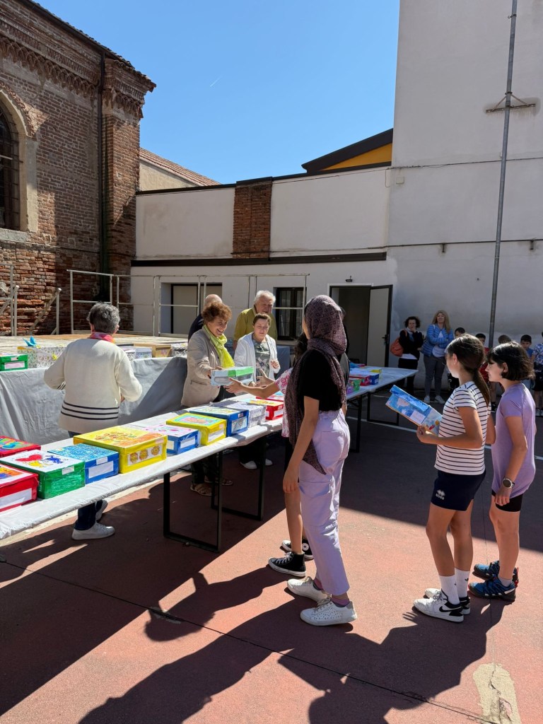 Al termine del momento a teatro, i ragazzi della secondaria si sono riuniti con i bambini della primaria nel cortila dell’oratorio per la consegna delle scatole ai volontari della Casa della Carità. In tutto, sono state consegnate più di 100 scatole solidali!