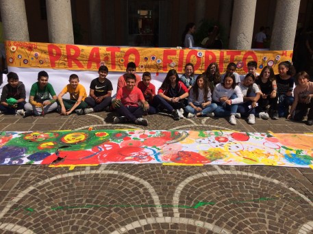 A questo punto, in ordine, ogni classe si è diretta verso l’altra parte della piazza che era stata allestita dagli insegnanti con lunghe strisce di carta bianche posate a terra. Su ogni striscia erano stati posizionati contenitori con colori a tempera e pennelli. Ogni ragazzo ha trovato posto accanto agli striscioni di carta e ha impugnato un pennello.