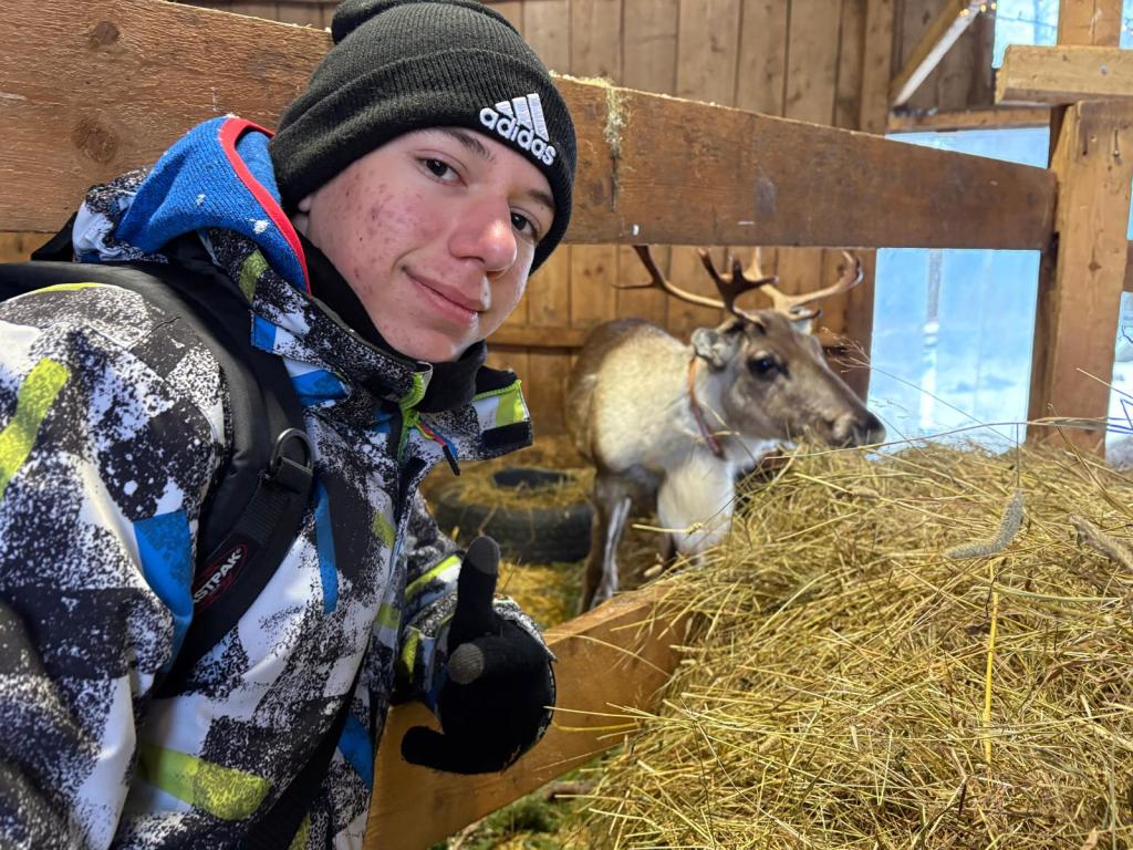 Il giorno dopo, ci siamo diretti alla fattoria Kertu. Tra caprette, lama, pecore, pony, galline e conigli c’erano anche le renne, a cui abbiamo potuto dar da mangiare dei licheni. Più tardi ci siamo riuniti intorno ad un falò e abbiamo mangiato delle ottime salsicce alla brace. Dopo una bella battaglia a palle di neve, siamo tornati ognuno a casa sua per fare una rilassante sauna.