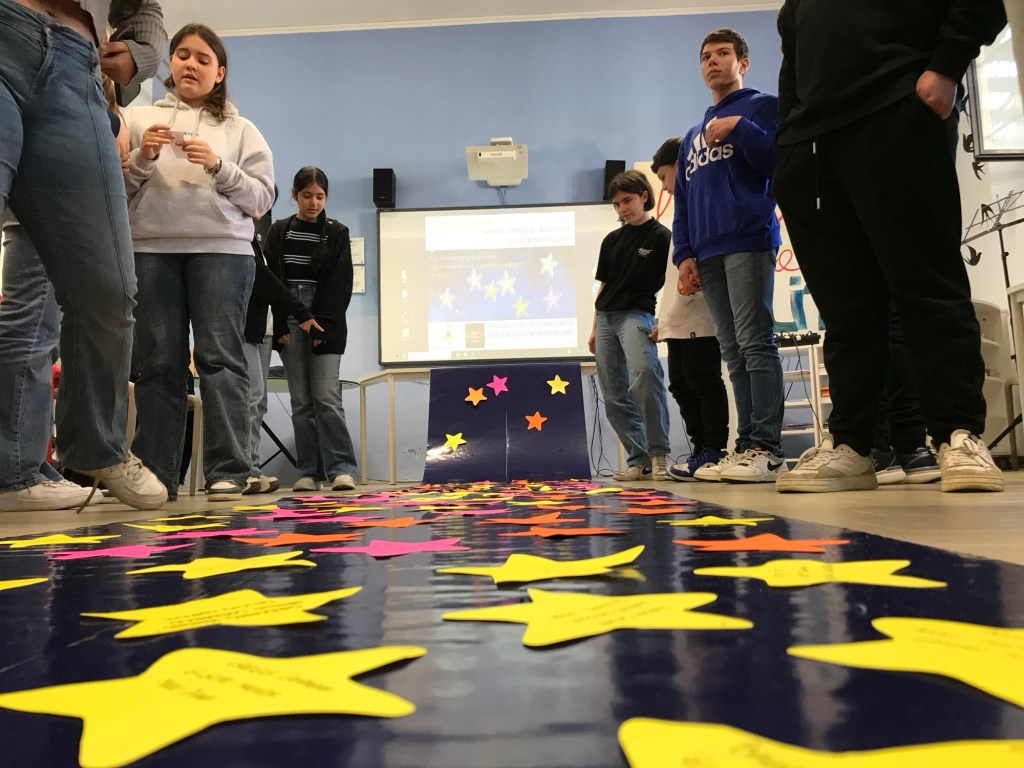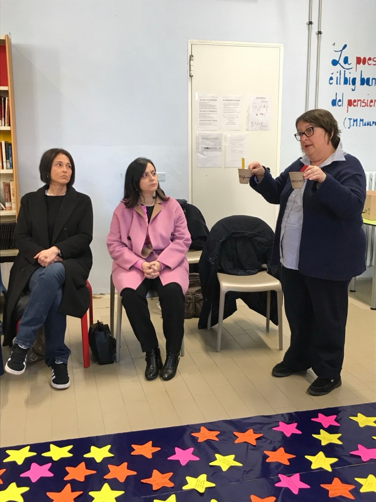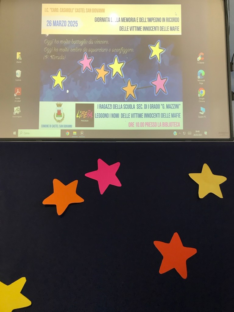 In biblioteca, era stato preparato uno striscione blu cielo che avremmo riempito con le nostre stelle per creare delle costellazioni di legalità: come le stelle ci guidano dal cielo, così la legalità ci deve guidare nelle nostre azioni sulla terra. A guidarci, le parole del poeta Pablo Neruda: