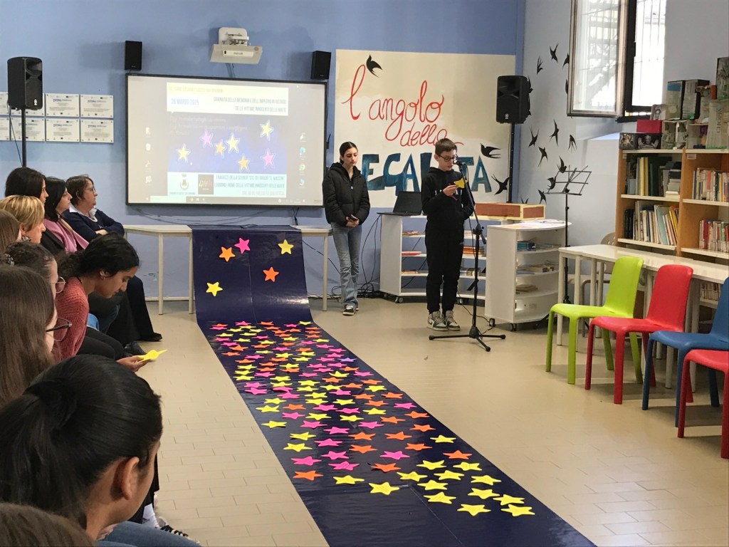 Tutte le classi terze della nostra scuola hanno partecipato a questa iniziativa e si sono preparate ritagliando delle stelle sulle quali ogni ragazzo ha scritto alcuni nomi che avrebbe letto.