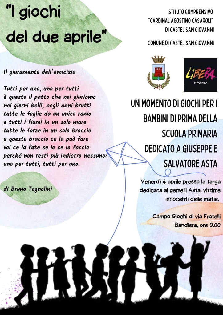 Il giorno 4 aprile, i bambini di prima della scuola primaria “Tina Pesaro” si recheranno al campo giochi di via Fratelli Bandiera per una mattina di giochi in ricordo della strage di Pizzolungo, dove persero la vita Giuseppe e Salvatore Asta, di 6 anni e la madre Barbara Rizzo. Si tratta di un evento all’interno del progetto sulla legalità che verrà gestito dalle classi 2 A e 2 E della scuola secondaria “Giuseppe Mazzini”.