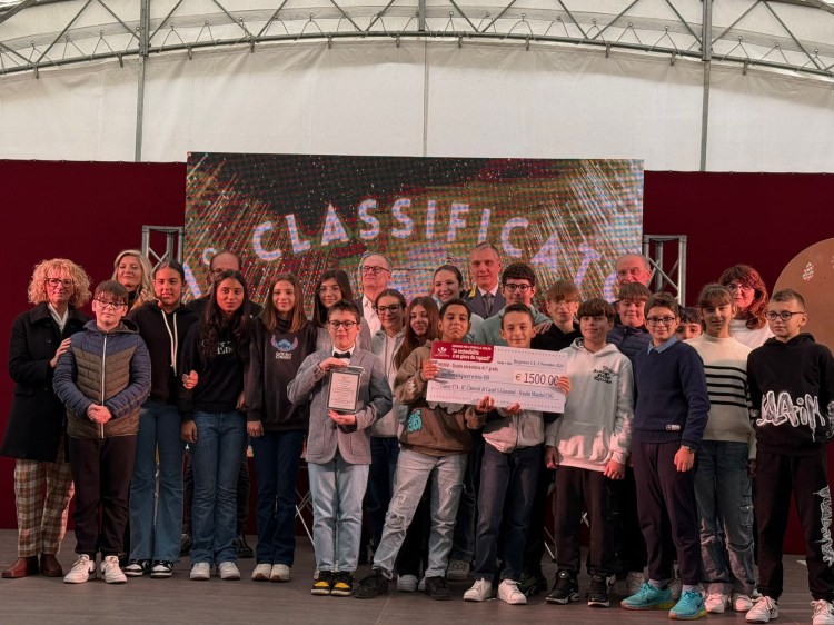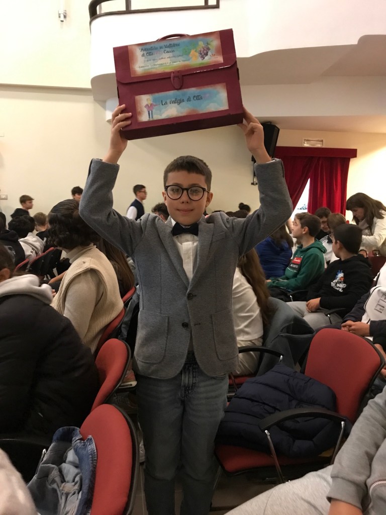 Superato l’ultimo step, la classe ha aspettato con ansia il momento della premiazione, il 9 novembre 2025. Per l’occasione, ci siamo dunque ritrovati a Borgonovo con le professoresse Cesena e Antoniotti. L’evento prevedeva di iniziare con la premiazione delle scuole primarie, poi le secondarie di primo grado e poi quelle di secondo grado.Dopo le premiazioni delle elementari, che sembravano infinite, è giunto il nostro momento. I cuori battevano a mille, restavano tre classi da premiare, per la categoria secondaria di primo grado, poi due e… la presentatrice ha annunciato: “La seconda classificata è la 1^A di Gossolengo!”. Dalla sala delle premiazioni è partito un boato: era la 2^A, l’ultima rimasta, la vincitrice e noi i campioni! Siamo quindi saliti sul palco, e abbiamo ricevuto un assegno da € 1500. Poi è seguita la festa, con tanto di lancio del nostro compagno Alessio, il nostro OttaVINO. E’ stata una grande emozione e una soddisfazione che non scorderemo.